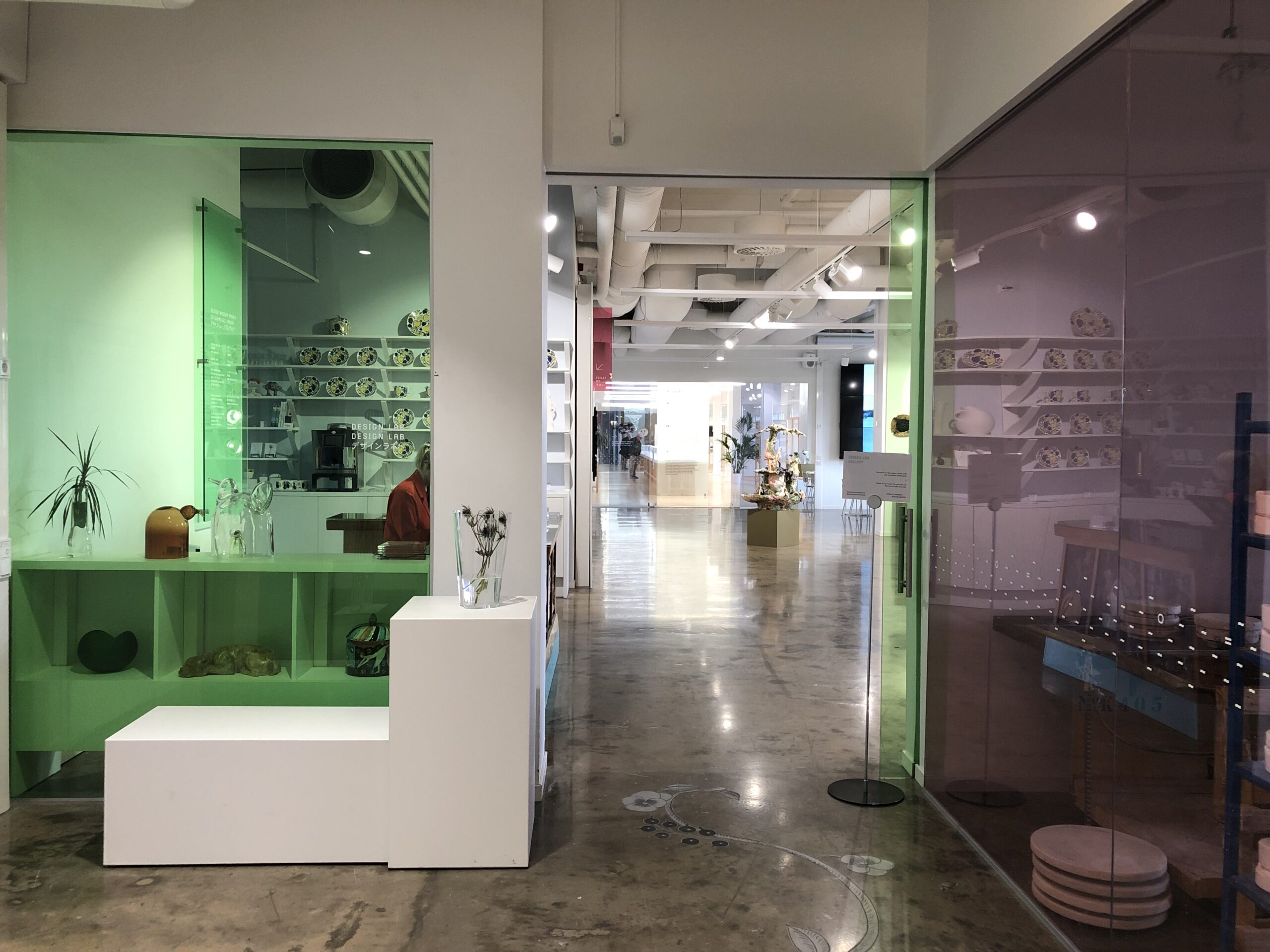 1階にあるショップ、インテリアの壁に陶器があしらわれている。