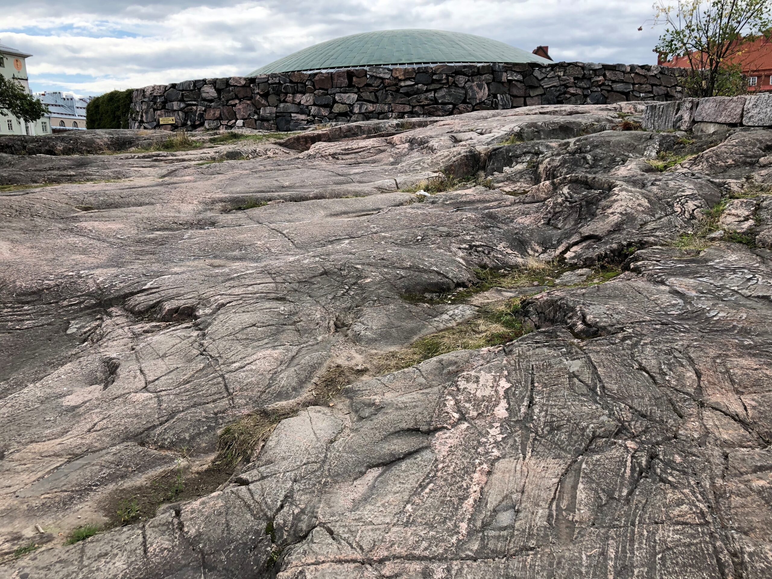 フィンランドの国土の特徴として氷河地形が多く見られます。ヘルシンキは氷河によって土壌が削り取られ、露出した岩盤の上に形成され都市であるとのこと。街中を歩くと所々に大きな岩盤が見られます。
